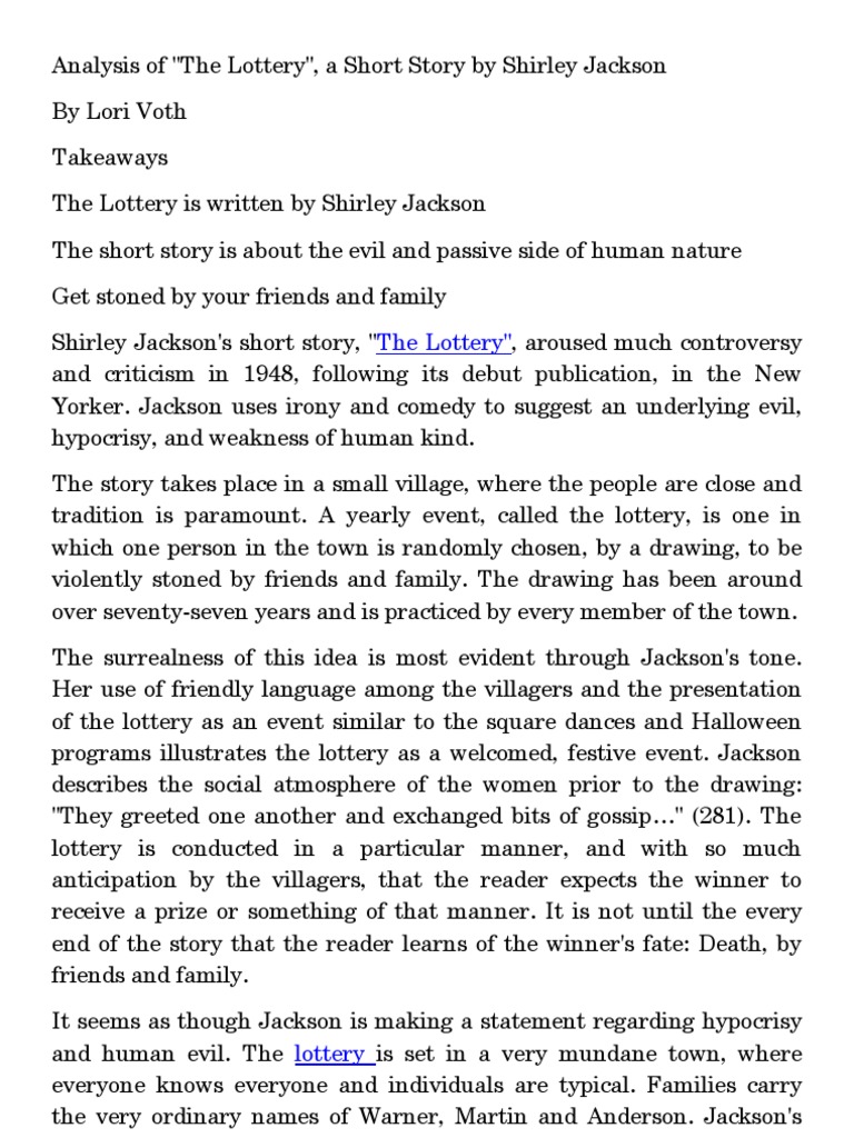 Though the ritual of stoning to death has certain historical basis, its meaning is rather symbolical and should not be taken literally by modern readers. The examples of scapegoating the others, including the limited essays on the lottery by shirley jackson of immigrants for finding a good job and the so-called glass ceiling due to which women receive lower salaries than men doing the same job and have lower chances for career promotion clearly represent the phenomenon of scapegoating in modern community. After the short story was published in The New Yorker inthe author received hundreds of hostile letters from the readers objecting to the brutal ending of the story.